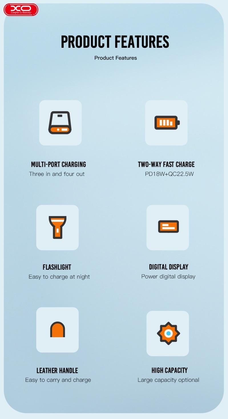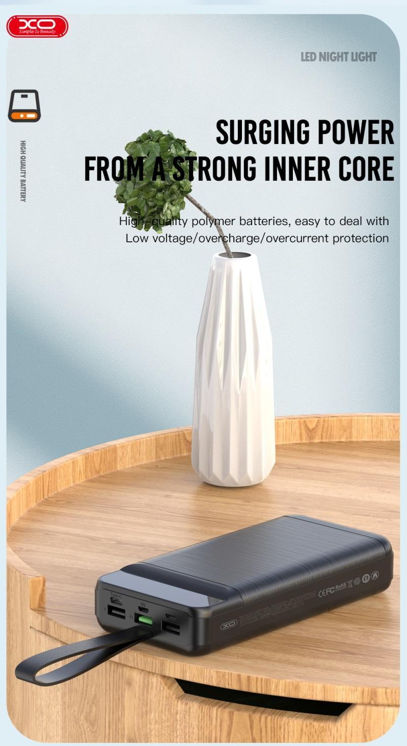 XO PR158 - Powerbank 22,5W med 3 x USB-A QC & 1 x USB-C PD 20W, den ultimata powerbanken designad för att hålla dina enheter laddade när du är på språng. Med en kapacitet på 50 000 mAh kan du ladda dina enheter flera gånger innan du måste ladda powerbanken igen.