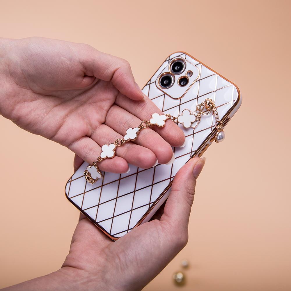Det eleganta Glamour-överlägget är en kombination av glänsande och metalliska effekter. Produkten har ett upphöjt och skimrande quiltmönster med gyllene linjer. Dessutom har skalet en dekorativ kedja som hjälper till att hålla i smartphonen och är en dekoration.