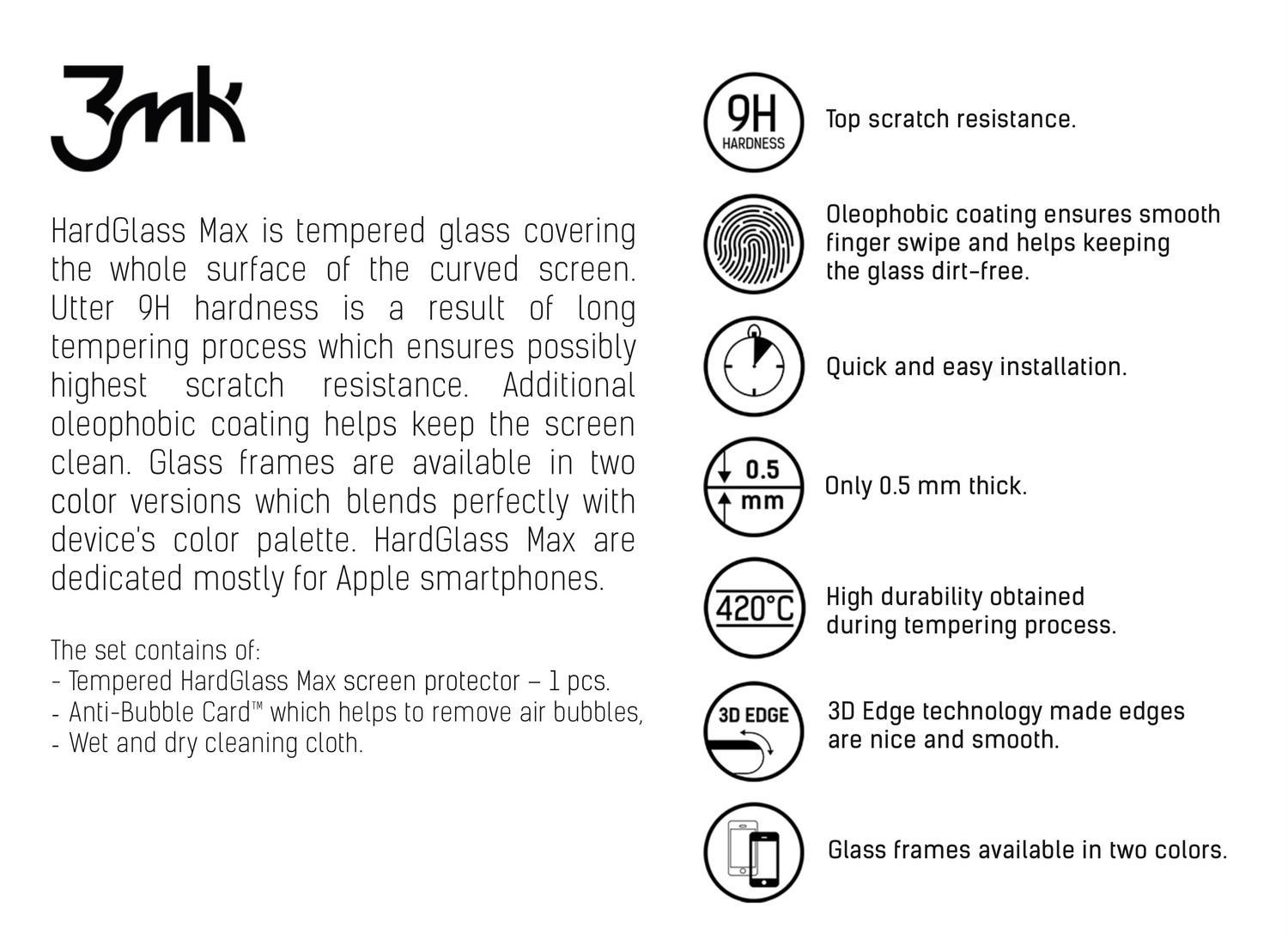 HardGlass Max FingerPrint är härdat glas som skyddar hela ytan på den rundade skärmen. Dess 9H hårdhet säkerställer högsta möjliga reptålighet och erhölls under härdning vid 420 ° C. Ytterligare ett oleofobiskt lager hjälper till att hålla glaset rent. Glasramen finns i en färgversion som passar perfekt med enhetens originalfärger.
