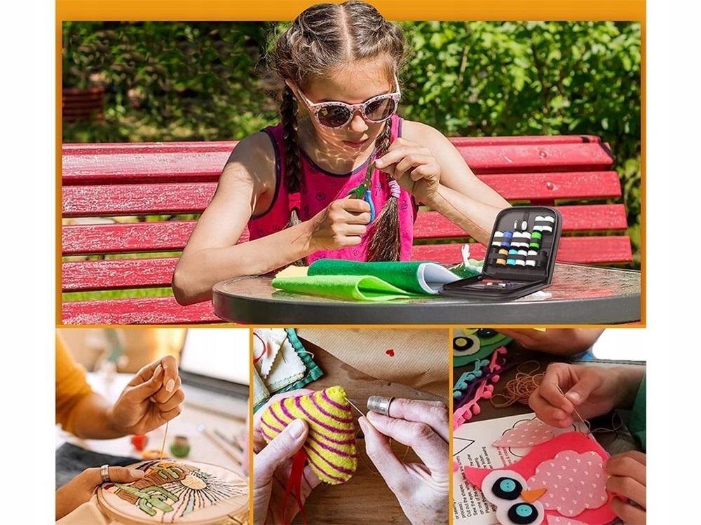 Setet innehåller även 5 säkerhetsnålar, 3 knappar, vass liten sax, en ripper
