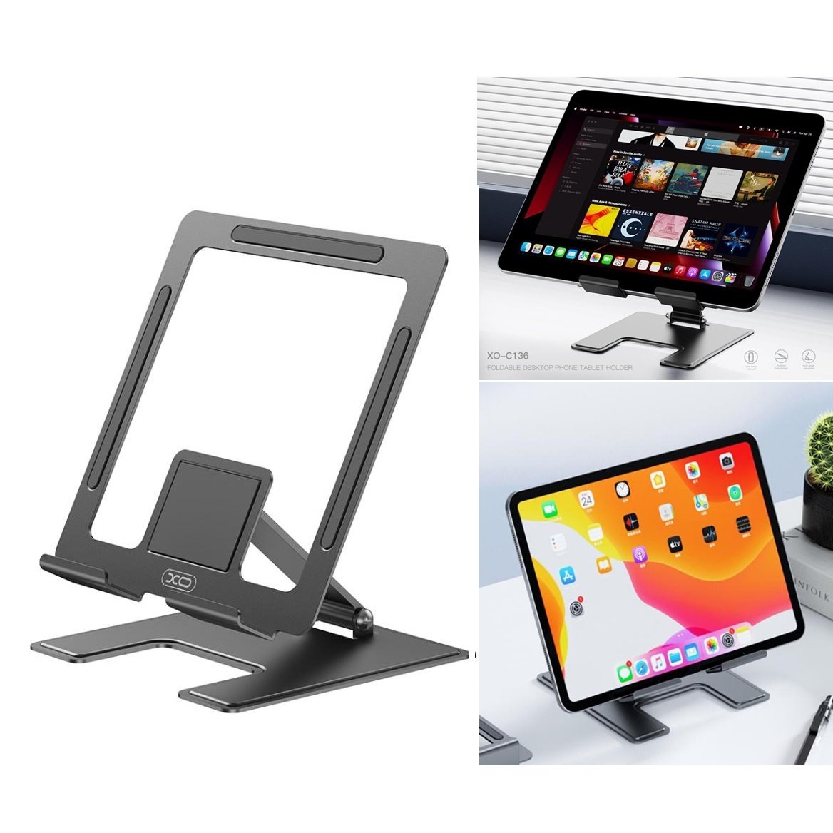 XO C136 är en universell surfplattahållare. Den rörliga armen gör att du kan vika hållaren platt och placera surfplattan i olika vinklar och höjder.